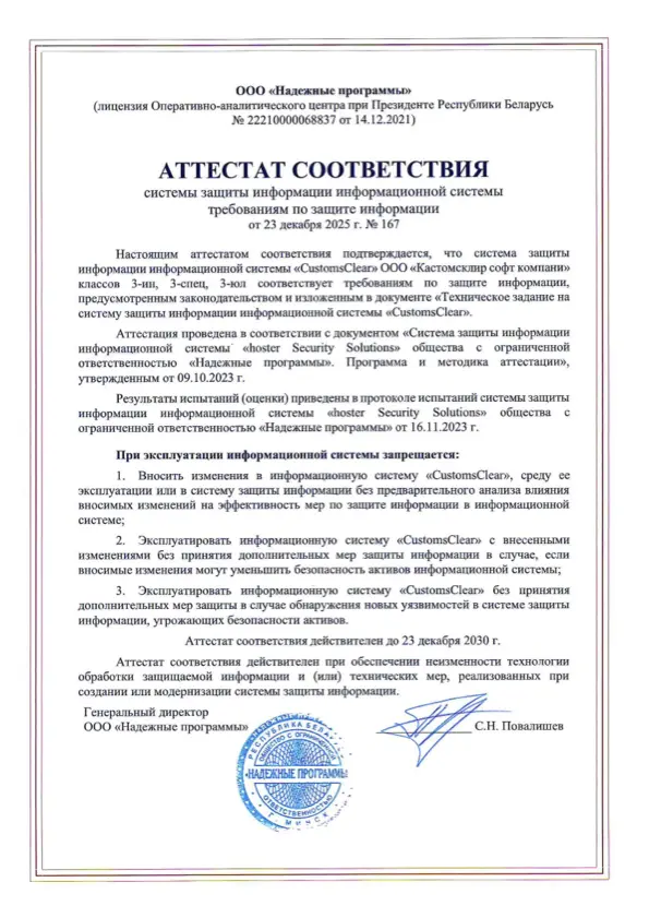 Мы прошли процедуру аттестации и получили аттестат соответствия, подтверждающий, что система отвечает требованиям защиты информации установленного класса.